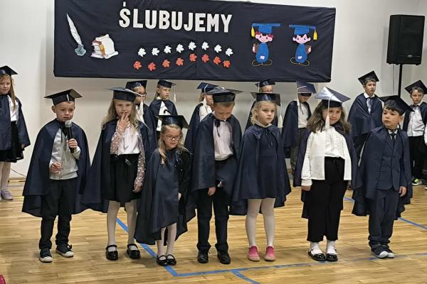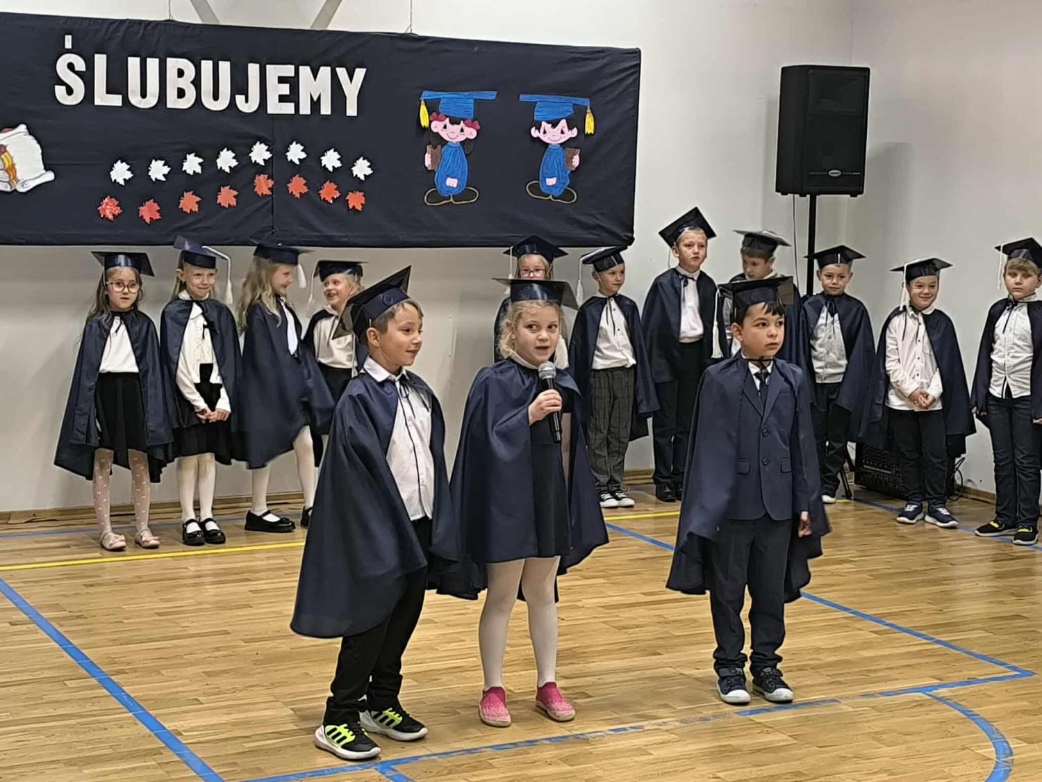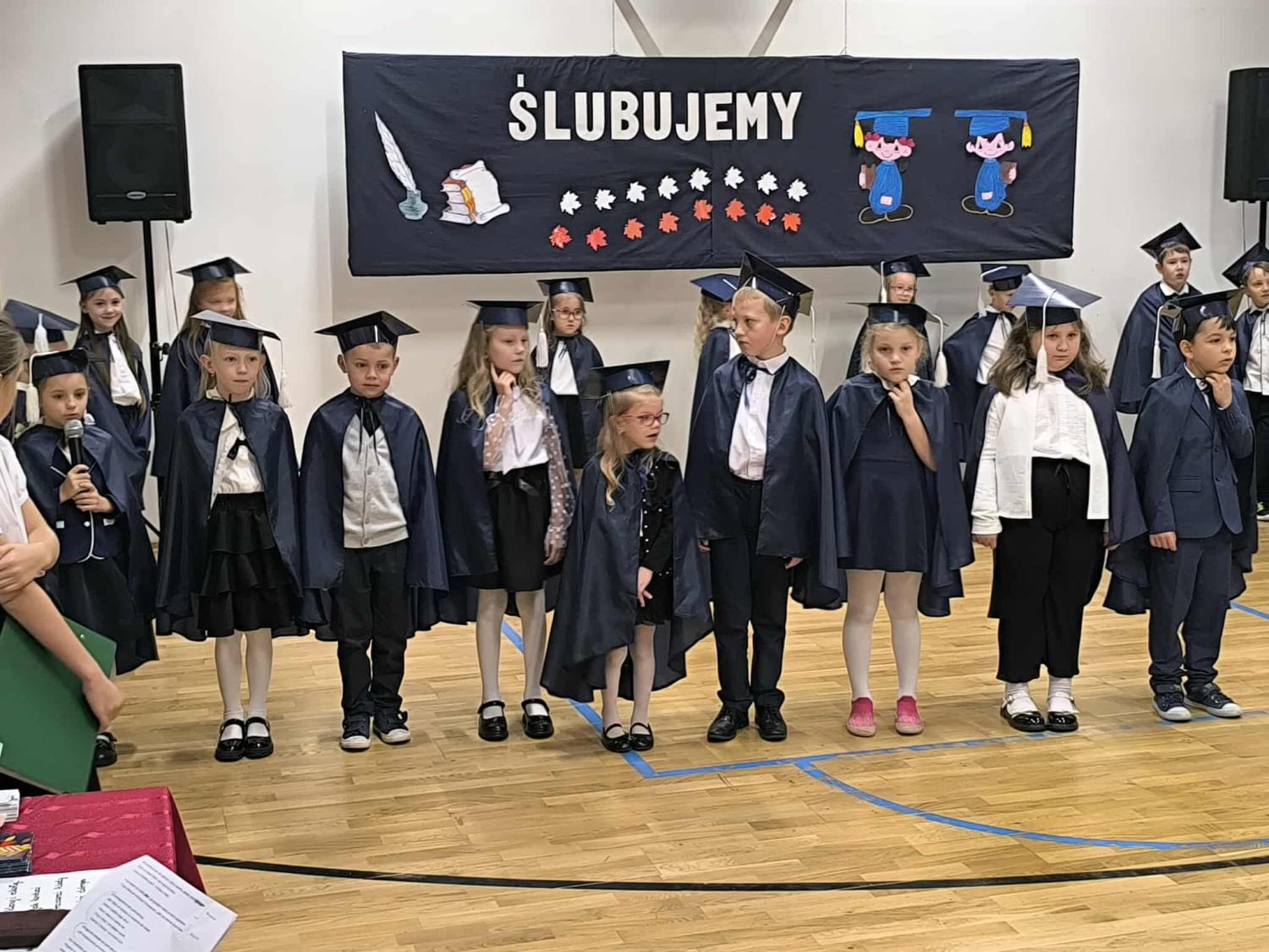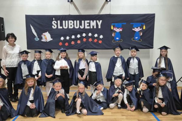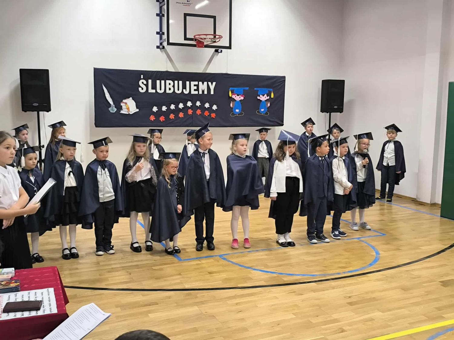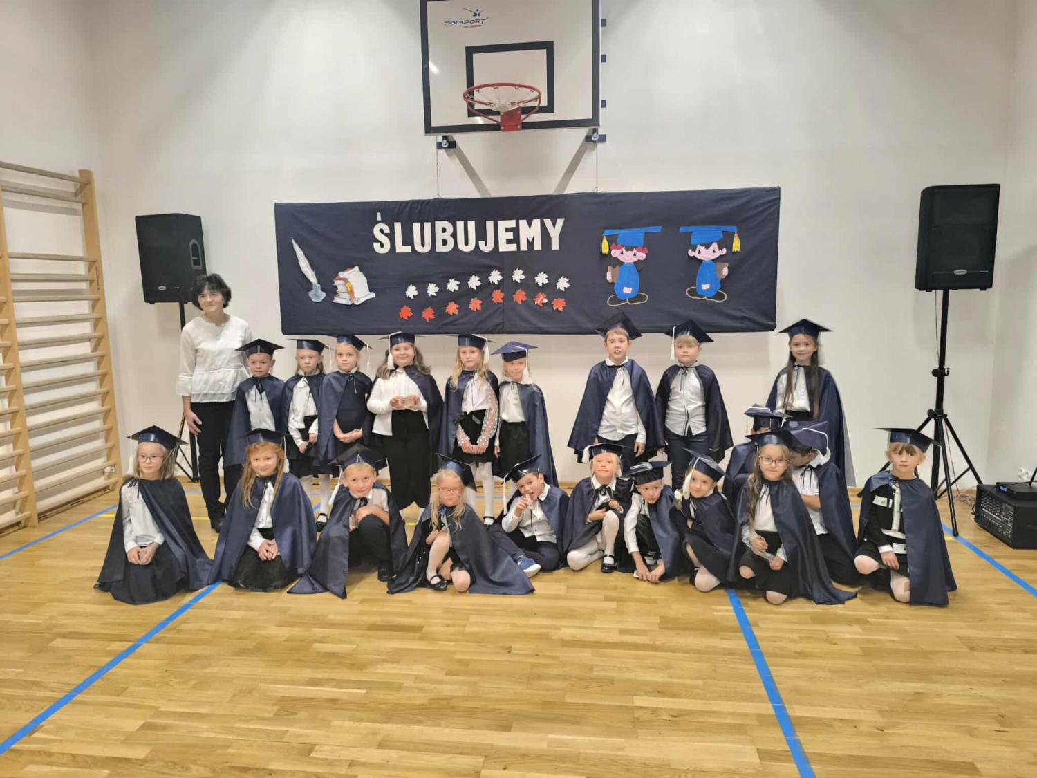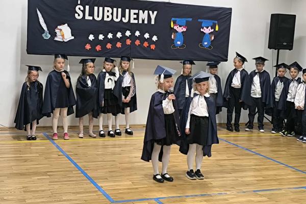 10 października 2025r. odbyło się uroczyste pasowanie uczniów klasy pierwszej. Ślubowanie to bardzo ważne wydarzenie nie tylko dla najmłodszych, ale również dla ich rodziców. W podniosłej atmosferze pierwszacy ślubowali być dobrymi uczniami i Polakami, godnie reprezentować swoją szkołę, swym zachowaniem i nauką sprawiać radość rodzicom i nauczycielom. Po złożeniu ślubowania Pani Dyrektor Małgorzata Ziemianek dokonała symbolicznego pasowania na ucznia dotykając ołówkiem ramion pierwszoklasistów. Zanim jednak maluchy zostały przyjęte do grona społeczności szkolnej musiały przedstawić to, czego już się w szkole nauczyły. Odświętnie ubrani i bardzo przejęci przystąpili do zaprezentowania swoich umiejętności. Pięknie zaśpiewali piosenki, z przejęciem recytowali wiersze oraz udzielali odpowiedzi na szereg ważnych pytań. Po zakończeniu uroczystości Ślubowania uczniowie otrzymali legitymacje, książeczki SKO oraz pamiątkowe dyplomy. Kochane Pierwszaki cieszymy się, że jesteście już uczniami i życzymy Wam sukcesów w nauce.