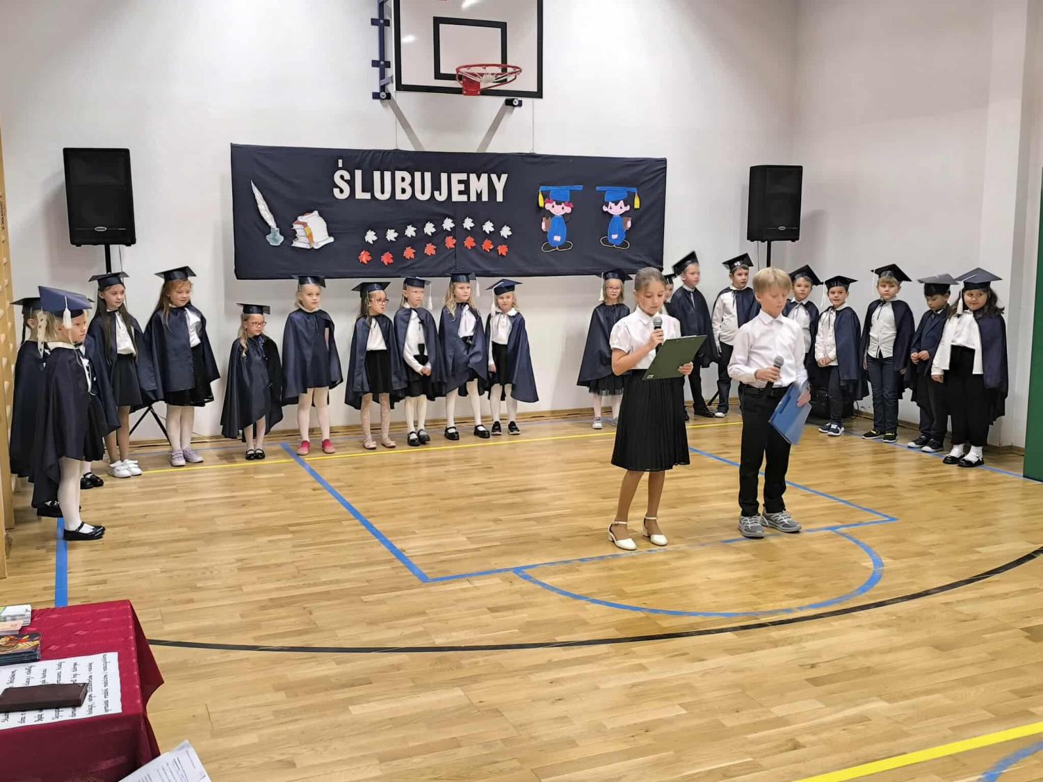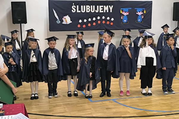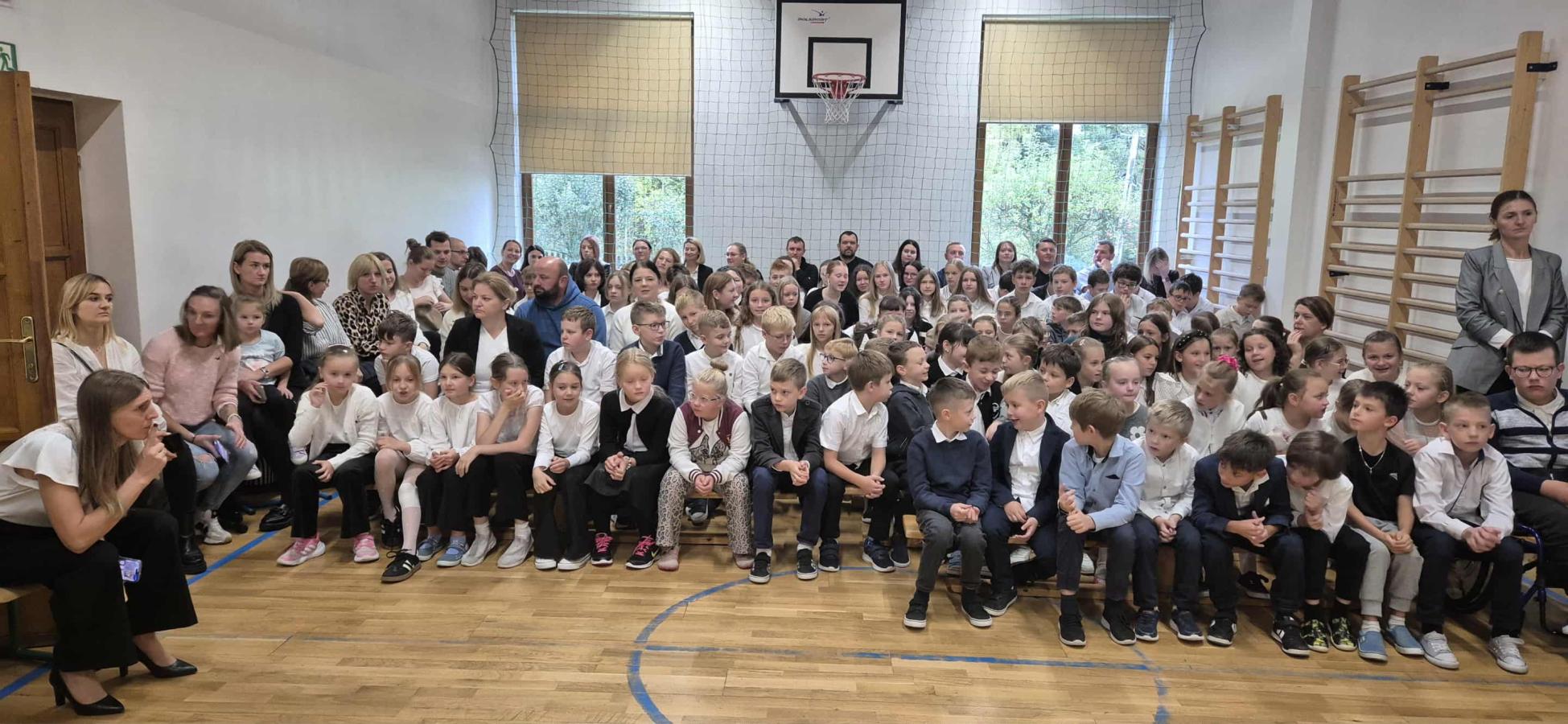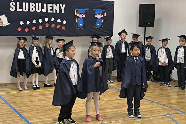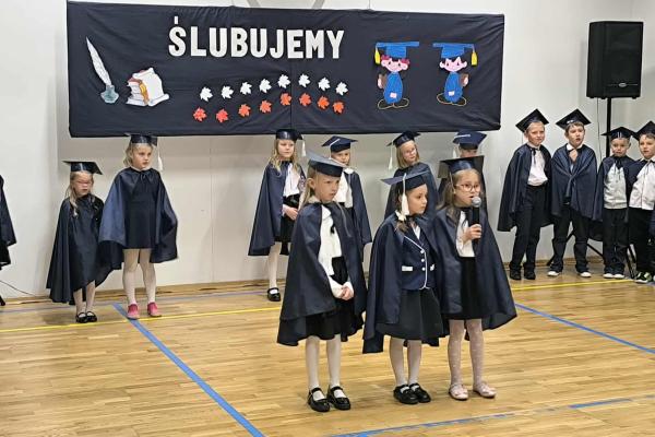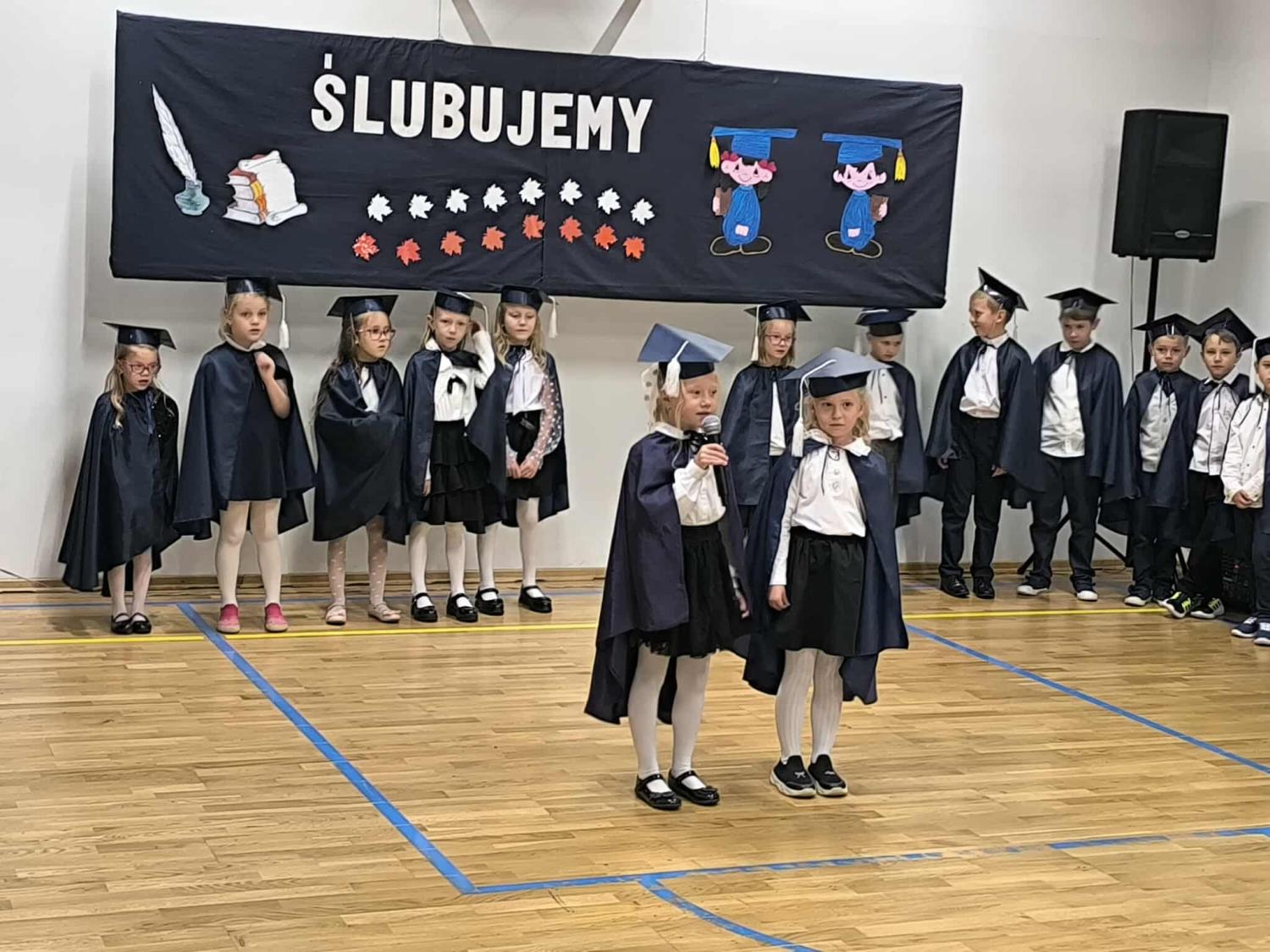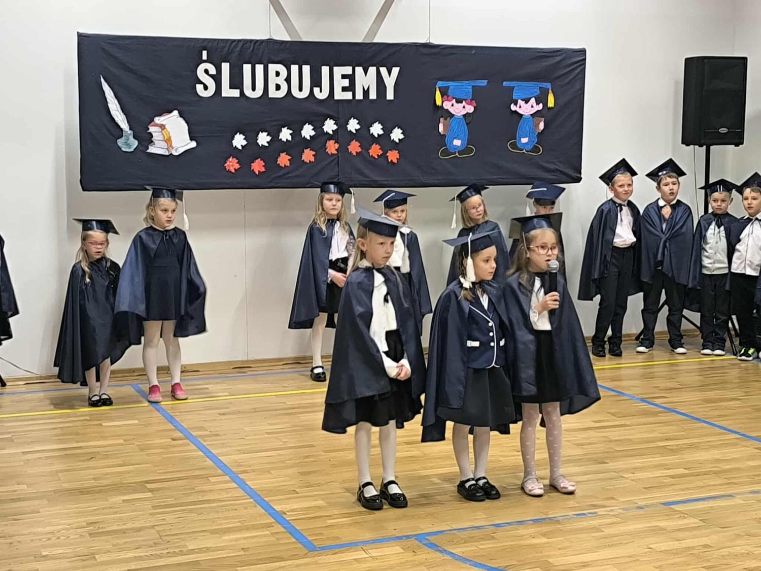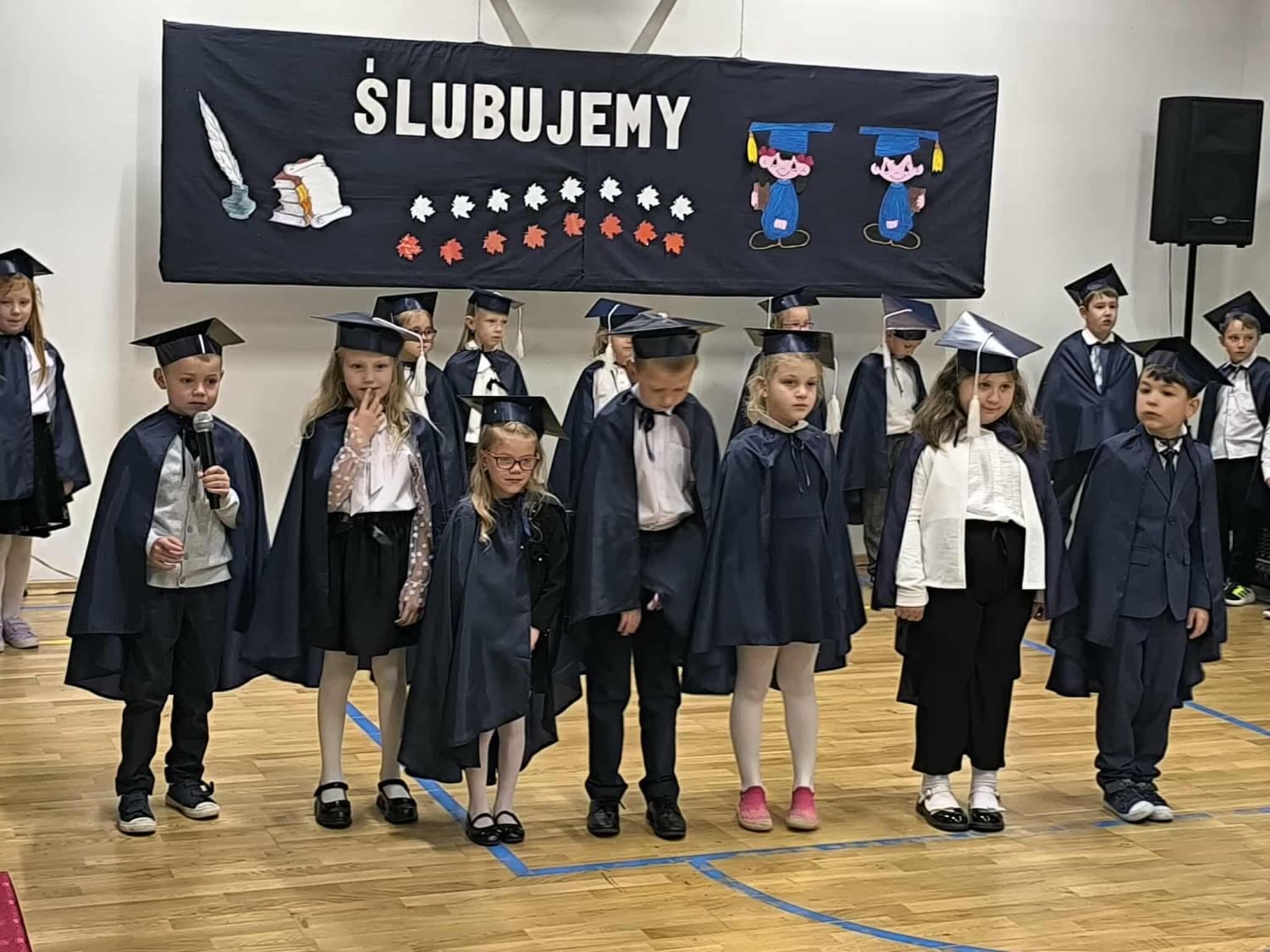 10 października 2025r. odbyło się uroczyste pasowanie uczniów klasy pierwszej. Ślubowanie to bardzo ważne wydarzenie nie tylko dla najmłodszych, ale również dla ich rodziców. W podniosłej atmosferze pierwszacy ślubowali być dobrymi uczniami i Polakami, godnie reprezentować swoją szkołę, swym zachowaniem i nauką sprawiać radość rodzicom i nauczycielom. Po złożeniu ślubowania Pani Dyrektor Małgorzata Ziemianek dokonała symbolicznego pasowania na ucznia dotykając ołówkiem ramion pierwszoklasistów. Zanim jednak maluchy zostały przyjęte do grona społeczności szkolnej musiały przedstawić to, czego już się w szkole nauczyły. Odświętnie ubrani i bardzo przejęci przystąpili do zaprezentowania swoich umiejętności. Pięknie zaśpiewali piosenki, z przejęciem recytowali wiersze oraz udzielali odpowiedzi na szereg ważnych pytań. Po zakończeniu uroczystości Ślubowania uczniowie otrzymali legitymacje, książeczki SKO oraz pamiątkowe dyplomy. Kochane Pierwszaki cieszymy się, że jesteście już uczniami i życzymy Wam sukcesów w nauce.
