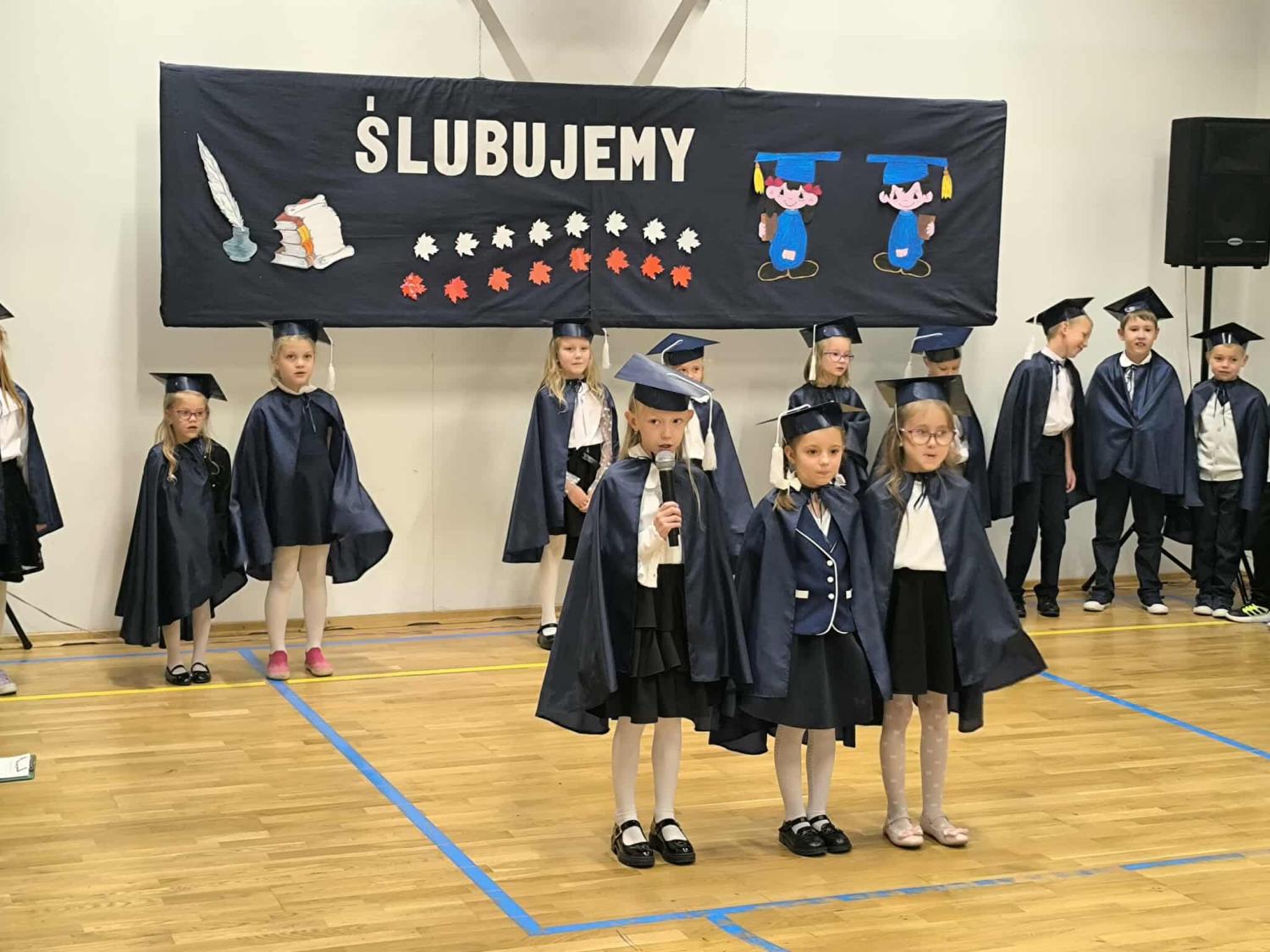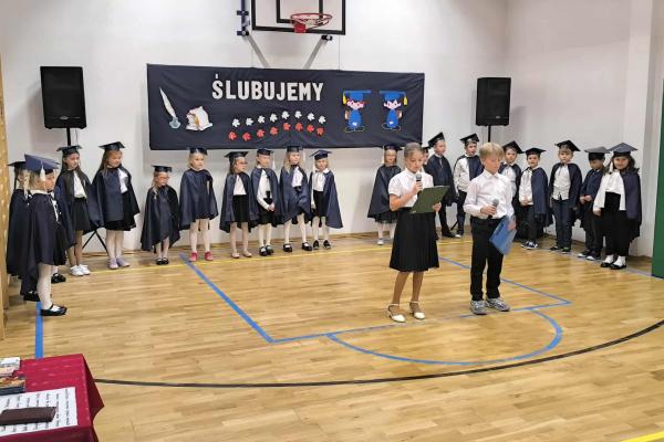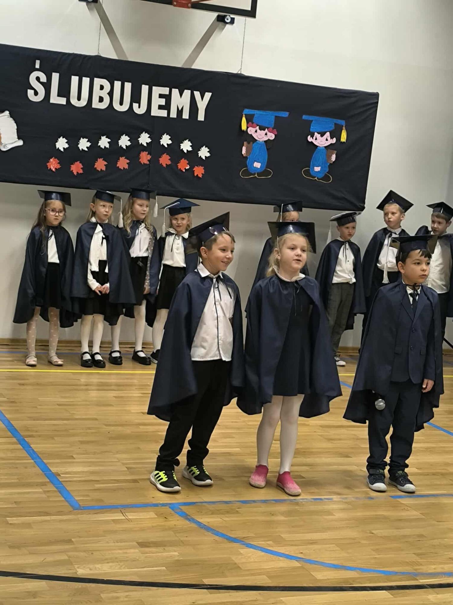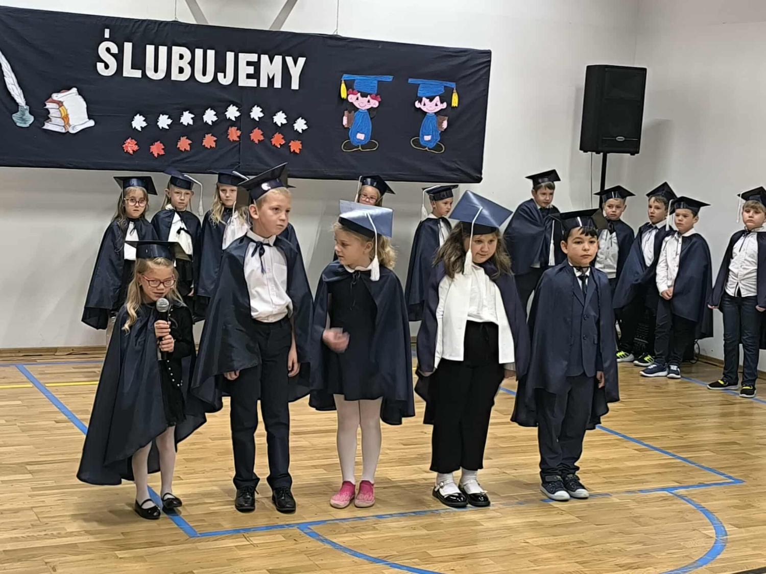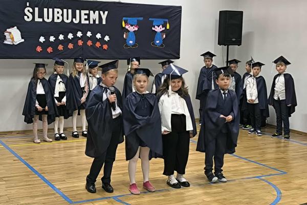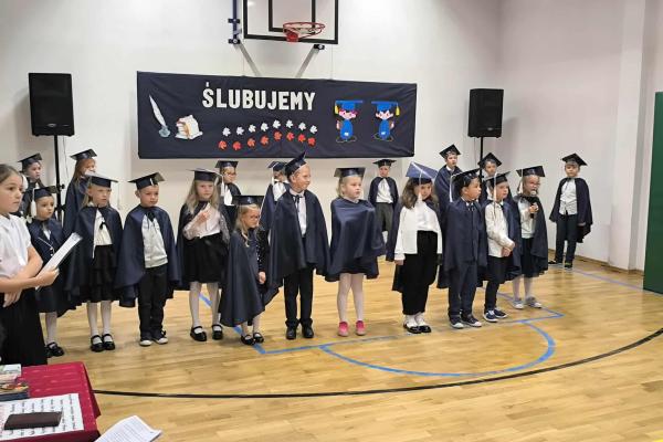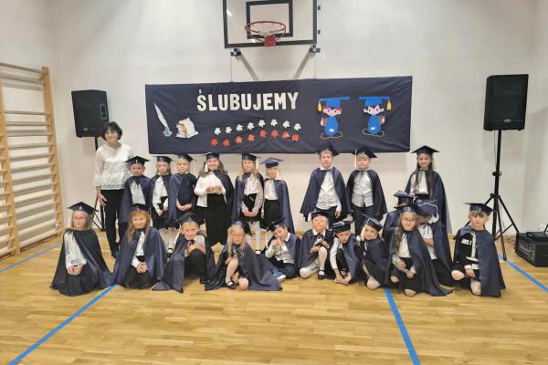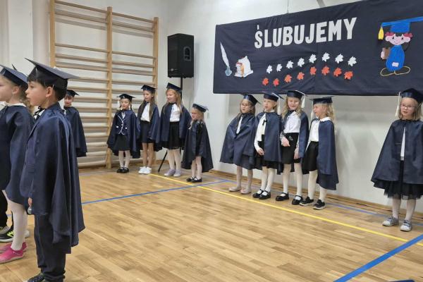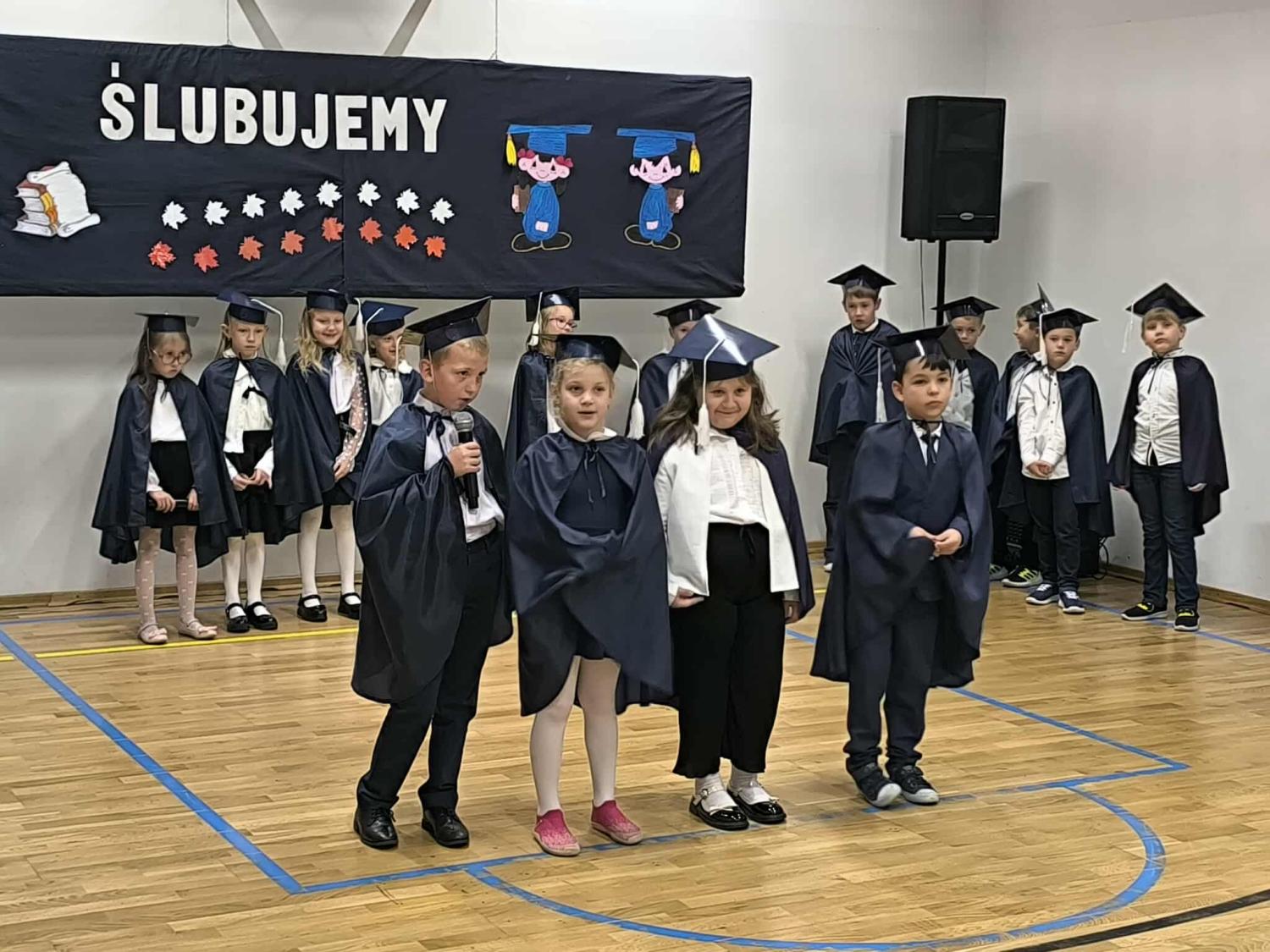10 października 2025r. odbyło się uroczyste pasowanie uczniów klasy pierwszej. Ślubowanie to bardzo ważne wydarzenie nie tylko dla najmłodszych, ale również dla ich rodziców. W podniosłej atmosferze pierwszacy ślubowali być dobrymi uczniami i Polakami, godnie reprezentować swoją szkołę, swym zachowaniem i nauką sprawiać radość rodzicom i nauczycielom. Po złożeniu ślubowania Pani Dyrektor Małgorzata Ziemianek dokonała symbolicznego pasowania na ucznia dotykając ołówkiem ramion pierwszoklasistów. Zanim jednak maluchy zostały przyjęte do grona społeczności szkolnej musiały przedstawić to, czego już się w szkole nauczyły. Odświętnie ubrani i bardzo przejęci przystąpili do zaprezentowania swoich umiejętności. Pięknie zaśpiewali piosenki, z przejęciem recytowali wiersze oraz udzielali odpowiedzi na szereg ważnych pytań. Po zakończeniu uroczystości Ślubowania uczniowie otrzymali legitymacje, książeczki SKO oraz pamiątkowe dyplomy. Kochane Pierwszaki cieszymy się, że jesteście już uczniami i życzymy Wam sukcesów w nauce.