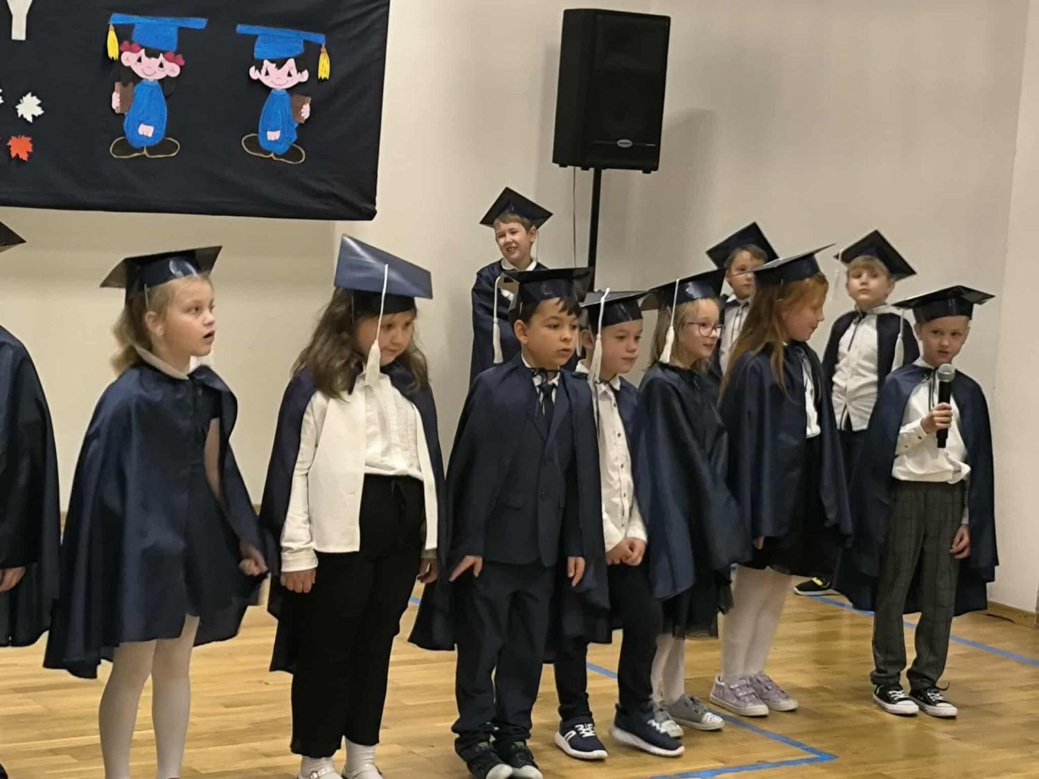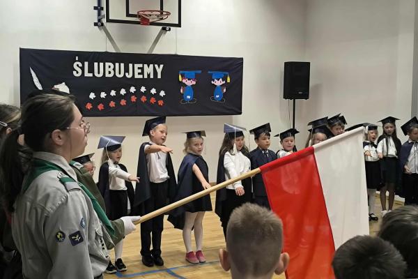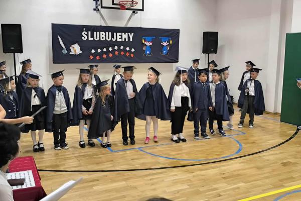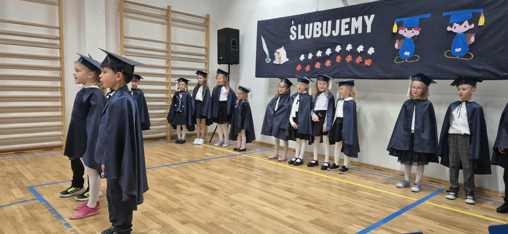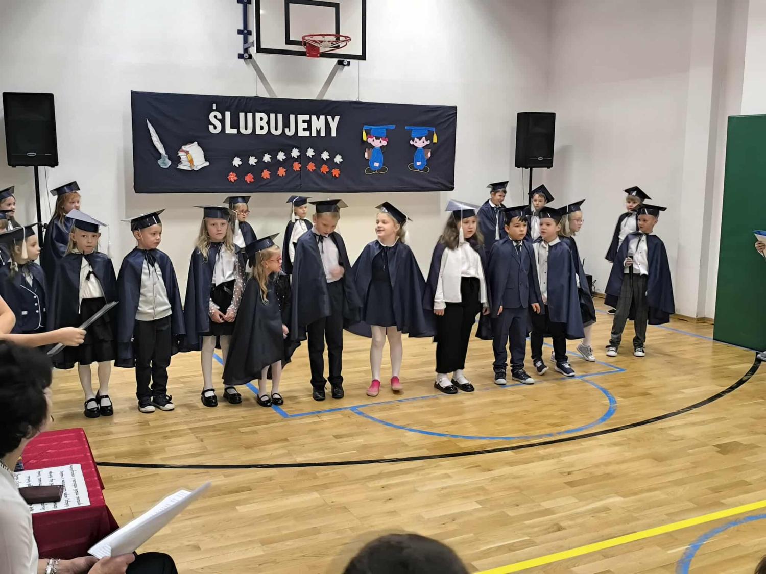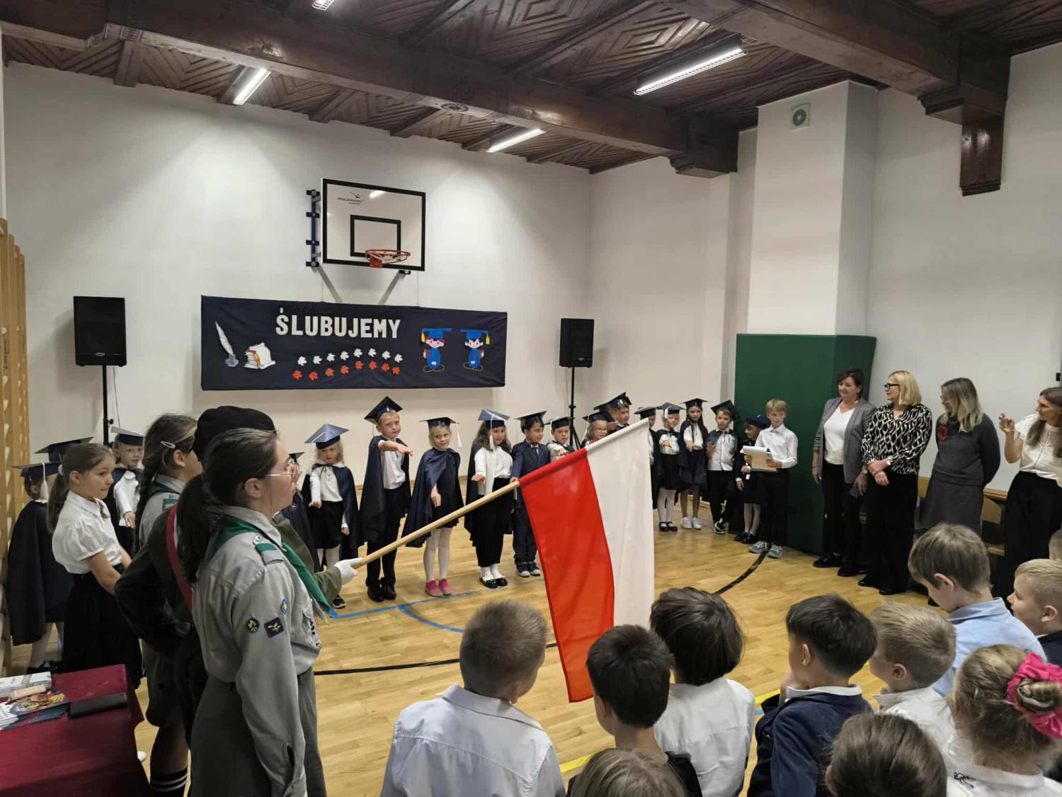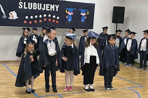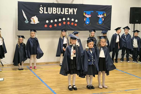 10 października 2025r. odbyło się uroczyste pasowanie uczniów klasy pierwszej. Ślubowanie to bardzo ważne wydarzenie nie tylko dla najmłodszych, ale również dla ich rodziców. W podniosłej atmosferze pierwszacy ślubowali być dobrymi uczniami i Polakami, godnie reprezentować swoją szkołę, swym zachowaniem i nauką sprawiać radość rodzicom i nauczycielom. Po złożeniu ślubowania Pani Dyrektor Małgorzata Ziemianek dokonała symbolicznego pasowania na ucznia dotykając ołówkiem ramion pierwszoklasistów. Zanim jednak maluchy zostały przyjęte do grona społeczności szkolnej musiały przedstawić to, czego już się w szkole nauczyły. Odświętnie ubrani i bardzo przejęci przystąpili do zaprezentowania swoich umiejętności. Pięknie zaśpiewali piosenki, z przejęciem recytowali wiersze oraz udzielali odpowiedzi na szereg ważnych pytań. Po zakończeniu uroczystości Ślubowania uczniowie otrzymali legitymacje, książeczki SKO oraz pamiątkowe dyplomy. Kochane Pierwszaki cieszymy się, że jesteście już uczniami i życzymy Wam sukcesów w nauce.