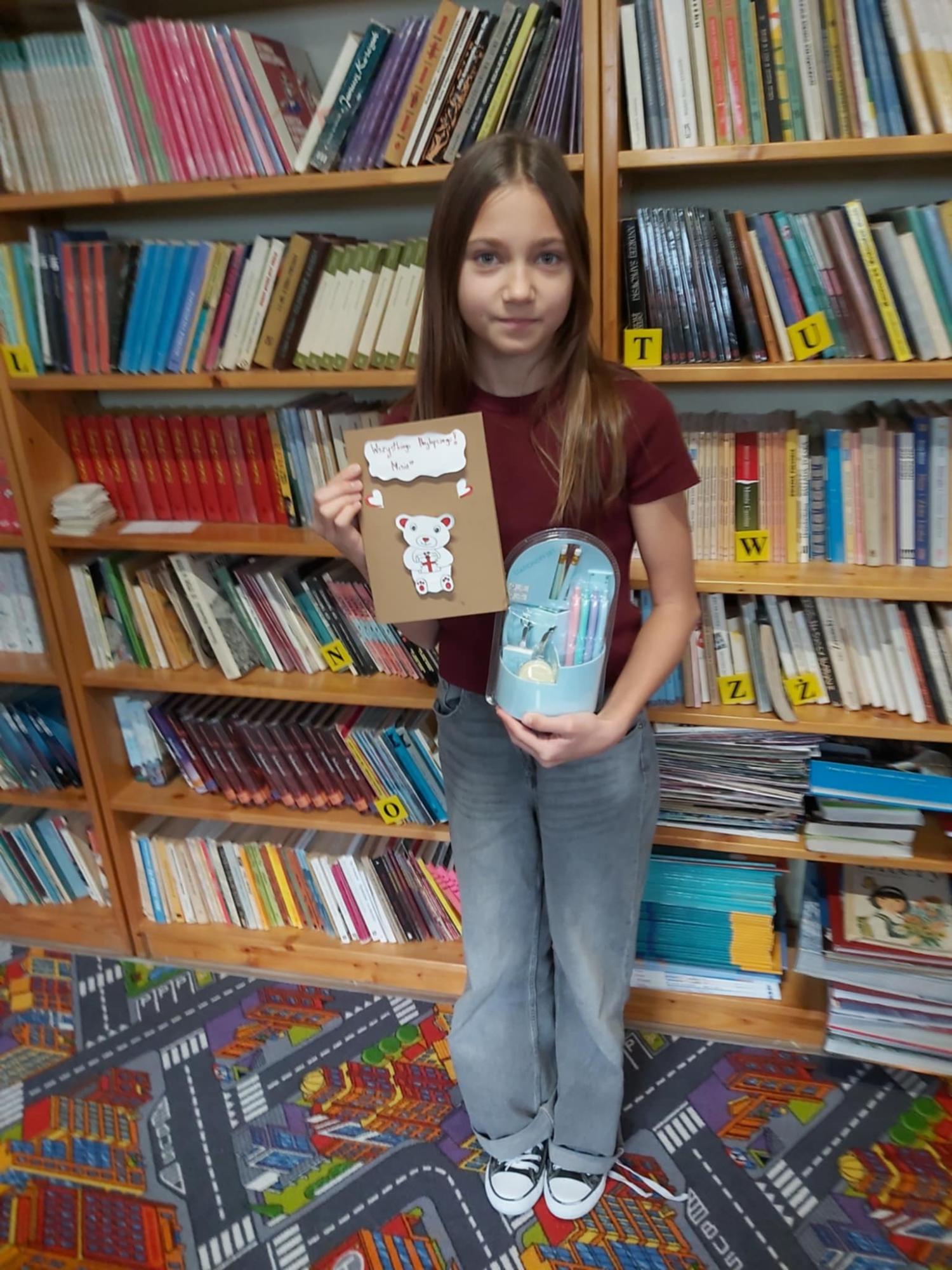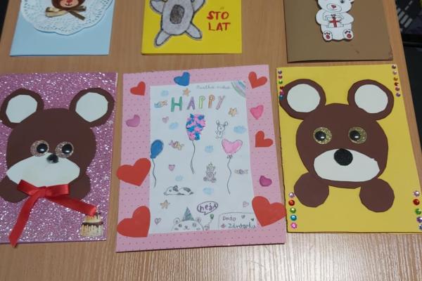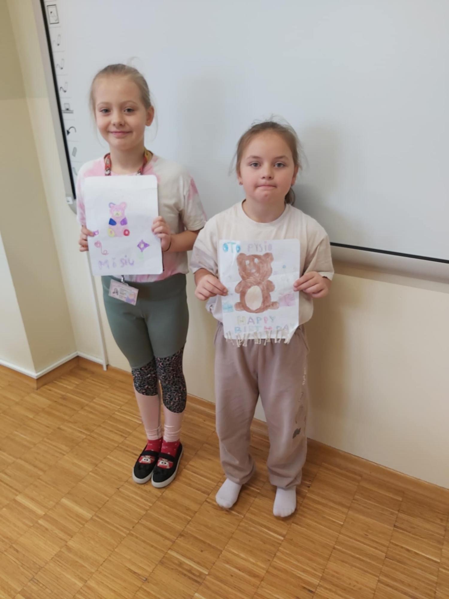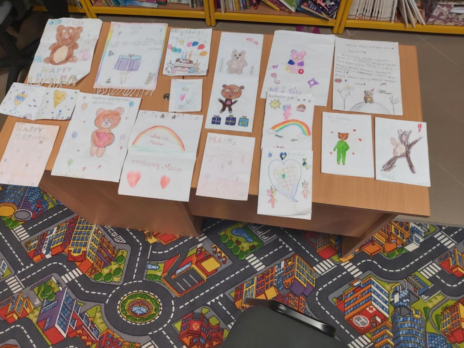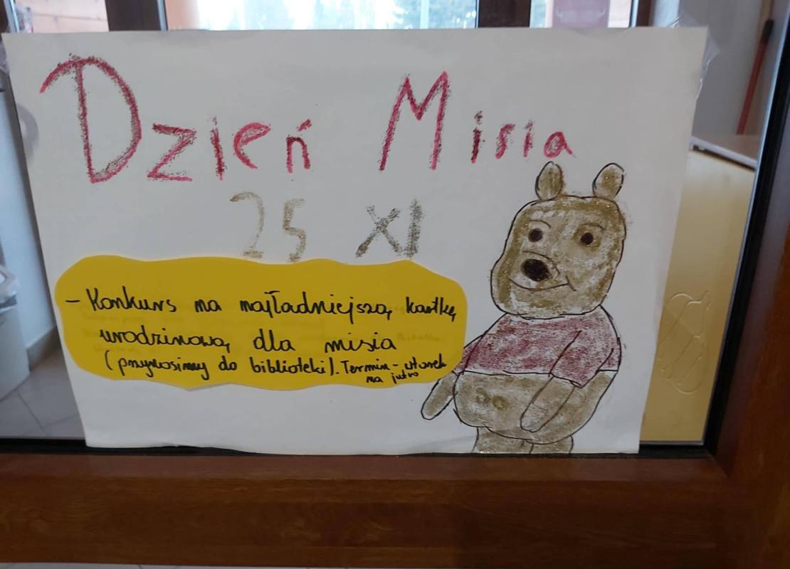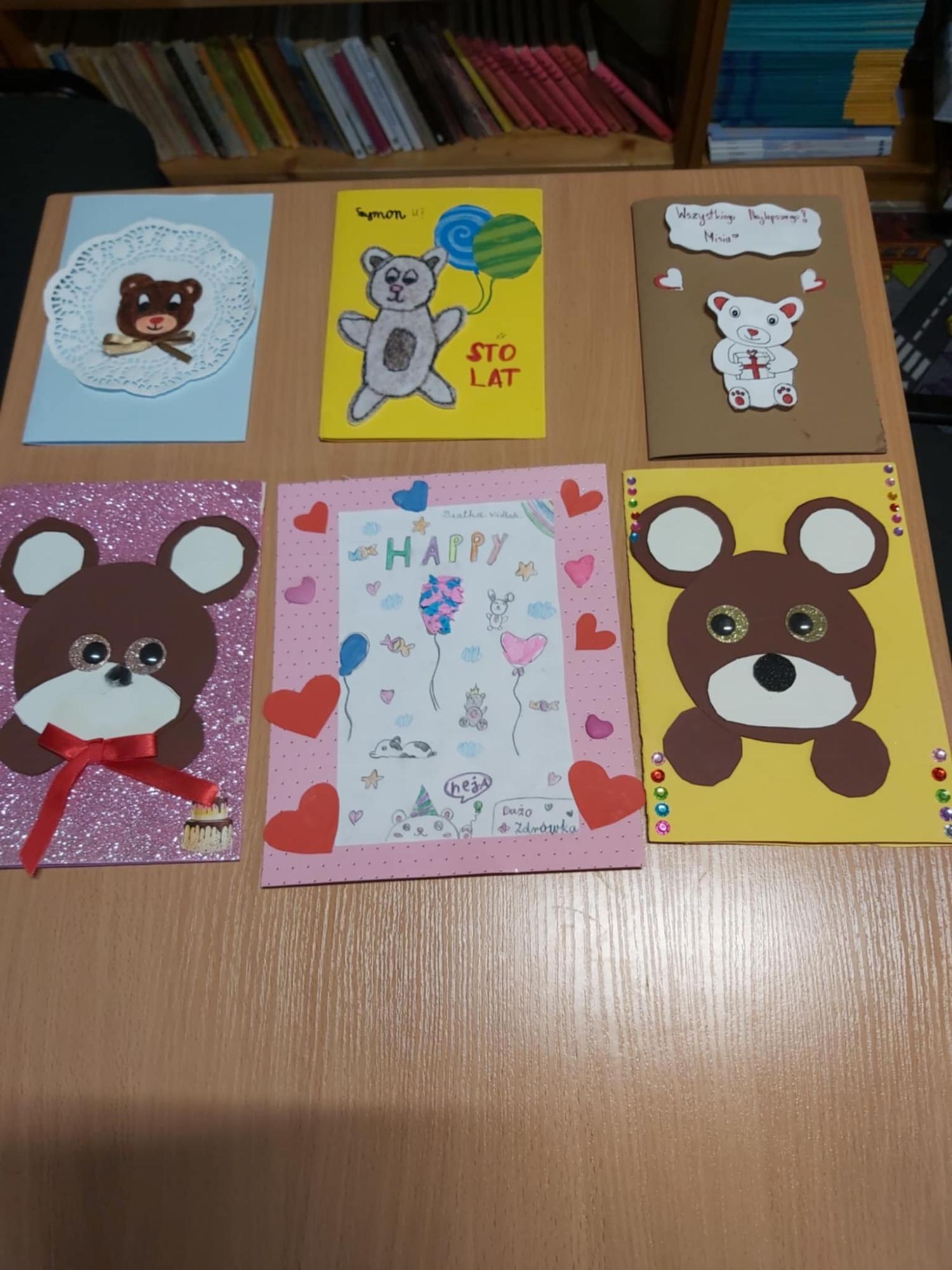 Z tej okazji zorganizowano także konkurs na najładniejszą kartkę urodzinową dla Misia. Uczniowie wykazali się ogromną kreatywnością – kartki były kolorowe, starannie wykonane i pełne serdecznych życzeń. Komisja miała trudne zadanie, ale ostatecznie wyłoniła laureatów, którzy otrzymali nagrody. Wszyscy uczniowie otrzymali nagrody pocieszenia i słodycze. Dzień Misia był pełen uśmiechu, dobrej zabawy i miłych wspomnień. Już nie możemy doczekać się kolejnej edycji tego wyjątkowego święta!