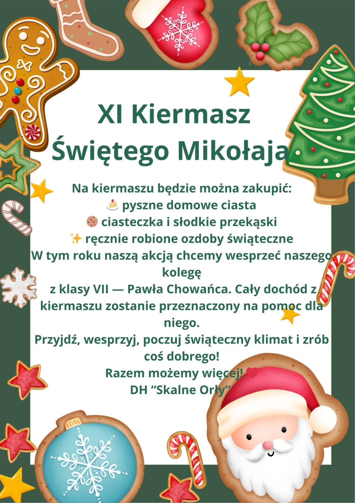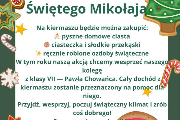 ręcznie robione ozdoby świąteczne. W tym roku naszą akcją chcemy wesprzeć naszego kolegę z klasy VII— Pawła Chowańca. Cały dochód z kiermaszu zostanie przeznaczony na pomoc dla niego. Przyjdź, wesprzyj, poczuj świąteczny klimat i zrób coś dobrego! Razem możemy więcej! ![]()