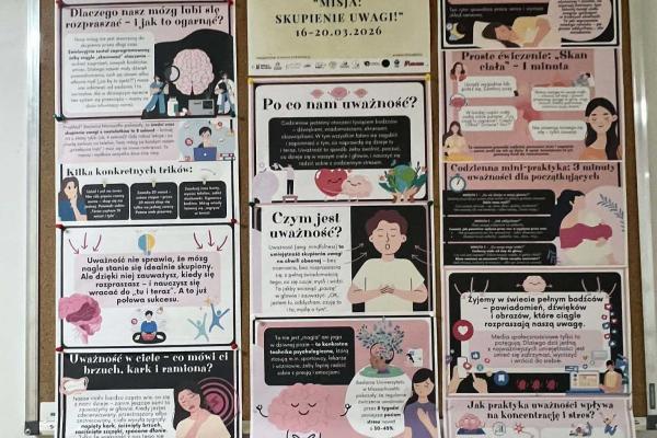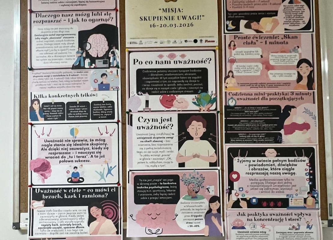 W dniach 16–20 marca w naszej szkole odbył się już po raz kolejny Ogólnopolski Tydzień Uważności – wyjątkowy czas zatrzymania, refleksji i świadomego bycia „tu i teraz”. W tych dniach codzienność szkolna nabrała innego rytmu. Uczniowie oraz nauczyciele wspólnie odkrywali, czym jest uważność, jak kierować swoją uwagę oraz jak budować umiejętność skupienia w świecie pełnym bodźców i rozproszeń. Tegoroczne hasło przewodnie brzmiało: „Misja: skupienie uwagi!”