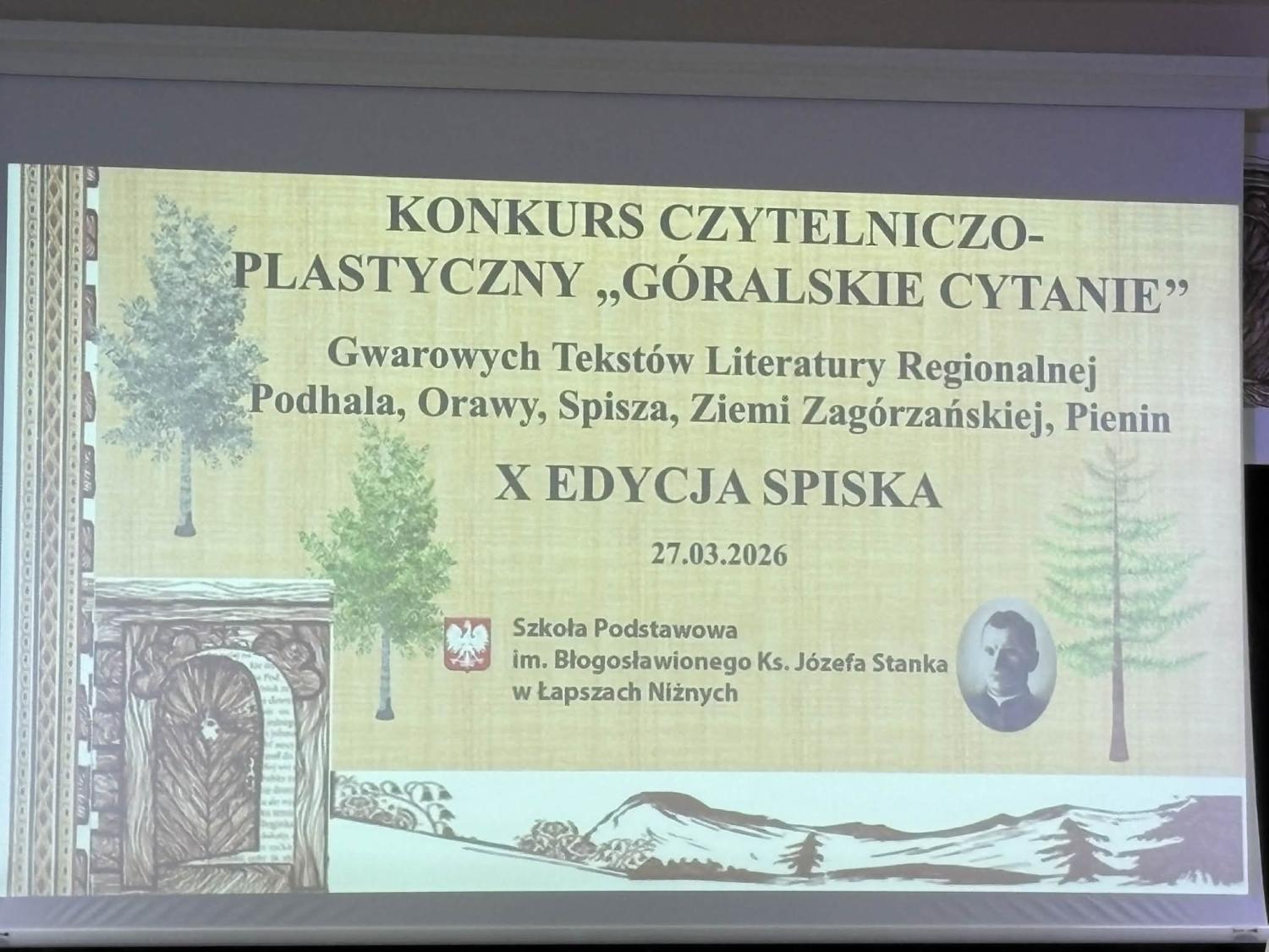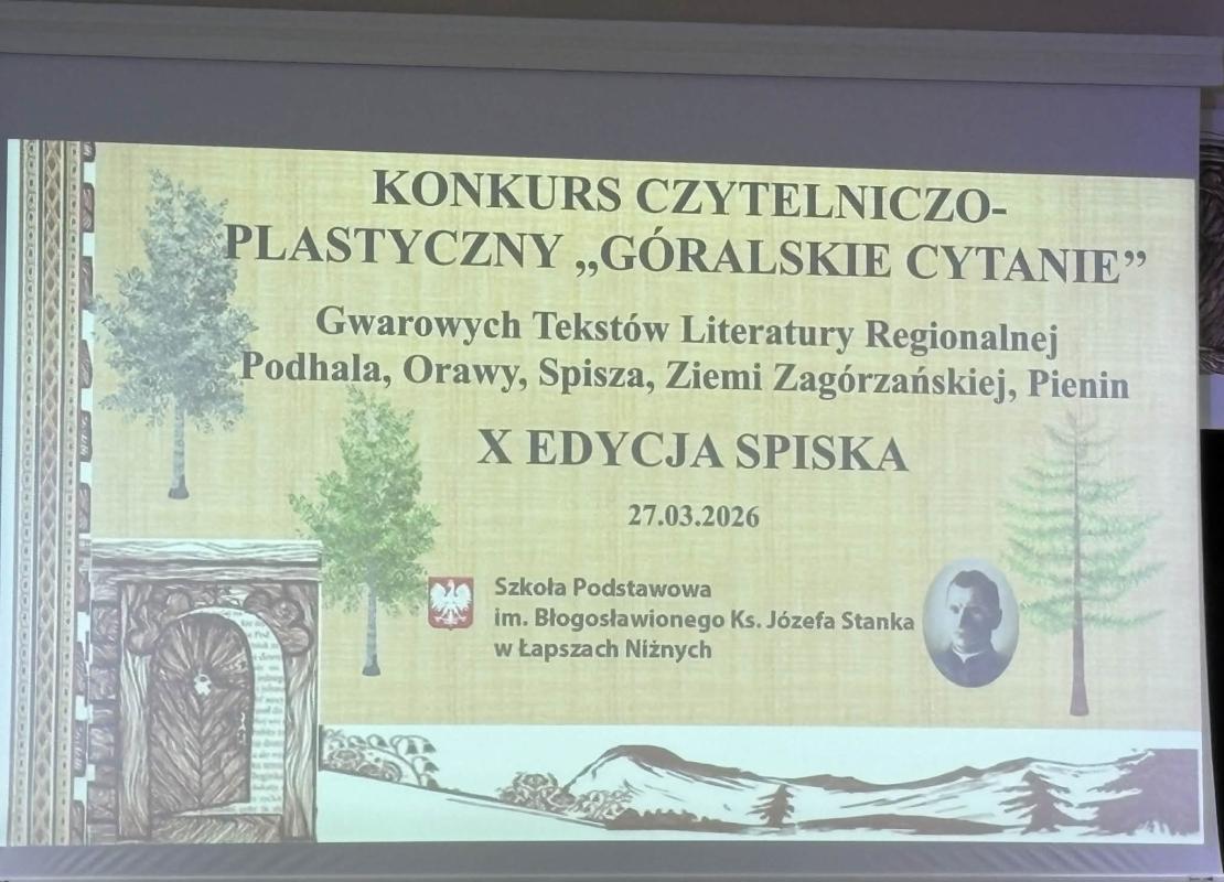 27 marca 2026 r. uczniowie naszej szkoły wzięli udział w etapie wojewódzkim X edycji Konkursu Czytelniczo-Plastycznego „Góralskie Cytanie” Gwarowych Tekstów Literatury Regionalnej Spisza, który odbył się w Szkole Podstawowej im. Błogosławionego Ks. Józefa Stanka w Łapszach Niżnych. Przesłaniem tego wydarzenia jest m. in. podtrzymywanie kultury i tradycji regionalnych oraz świadomego odbioru literatury regionalnej. Sam konkurs wspiera edukację polonistyczną uczniów w pracy z tekstem i rozwija ich uzdolnienia artystyczne. Piękno gwary, którą prezentują sami uczestnicy jak i przygotowane prace plastyczne i literackie są wyrazem ich szacunku dla kultury regionu i umiłowania Ojczyzny.